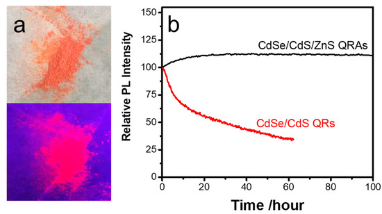 (a) QRAs powder under room light and UV irradiation; (b) long-term photostability of the CdSe/CdS and CdSe/CdS/ZnS QRAs under continuous excitation.