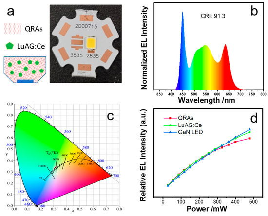 (a) The packaging structure and physical diagram of the QRA-based WLED package; (b) EL spectrum of the WLEDs; (c) color coordinates of the WLED at different driving powers; (d) relative light intensities of different light sources in WLED driven from 27 to 450 mW.