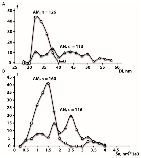 Figure 2A,B demonstrates poly-dispersed values of Di and Sa of AM and AN surfaces. Di distribution in AM surfaces is characterized by a single distinct peak showing that the most of nanotubes (67%) are characterized by Di of 32–34 nm. Though annealing led to an increase in the average Di, AN surfaces revealed a much wider Di frequency dispersal without any main peak (Figure 2A). While Di of 42 nm was a maximum for AM surfaces, 45% of AN TNTs had a Di ranging from 44 to 58 nm indicating that almost a half of AM TNTs has undergone an increase in their Di during the annealing at 500 °C. A similar trend was observed when AM and AN surface areas were compared (Figure 2B). 79% of AM surfaces showed Sa ranging from 1000 to 1750 nm2. On the other hand, a maximum frequency for Sa in AN surfaces was shifted to 2500 nm2, and 58% of AN TNTs demonstrated Sa within the range of 1750–2750 nm2.