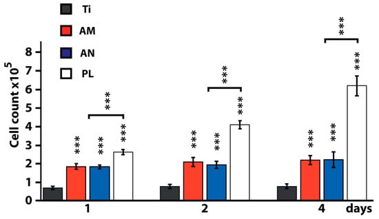 Figure 3. Primary rat osteoblasts adhesion and proliferation on flat titanium (Ti), amorphous (AM), anatase (AN) titania nanotubes (TNTs) substrates and cell culture plastic (PL) on day 1, 2 and 4. *** p < 0.01 for tested substrates versus Ti and for AM and AN versus PL.