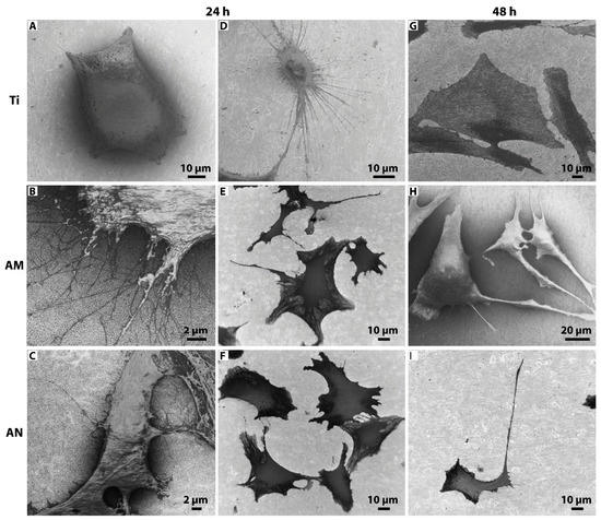 Figure 4. SEM micrographs of osteoblasts seeded on (A,D,G) flat Ti; (B,E,H) amorphous and (C,F,I) anatase TNTs layers after 24 and 48 h of culture.