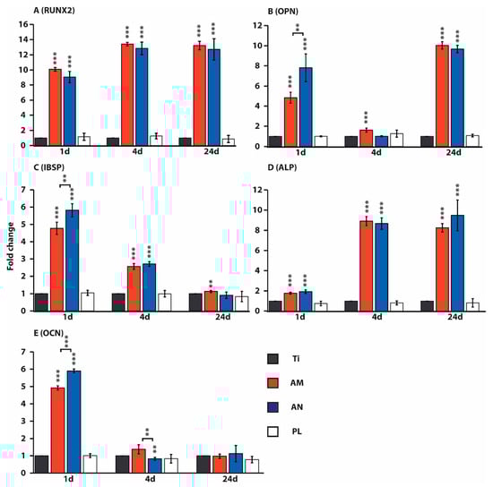 Figure 6. Effects of nanostructured titanium surfaces on mRNA expression of osteogenic genes in osteoblasts, cultured for 1, 4 and 24 days on flat titanium (Ti), anodized titanium of different crystallinity (amorphous (AM) and anatase (AN)) and cell culture plastic (PL). qRT-PCR of mRNA of runt-related transcription factor 2 (RUNX2, A), osteopontin (OPN, B), integrin binding sialoprotein (IBSP, C), alkaline phosphatase (ALP, D) and osteocalcin (OCN, E). ** p < 0.05, *** p < 0.01 for tested substrates versus Ti and for AM vs. AN.