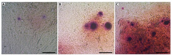 Figure 7. Alizarin red staining of cells cultured on flat titanium (A), amorphous (B) and anatase TiO2 layered substrates (C) in non-osteogenic medium after 24 d of culture. Scale bar: 100 µm.