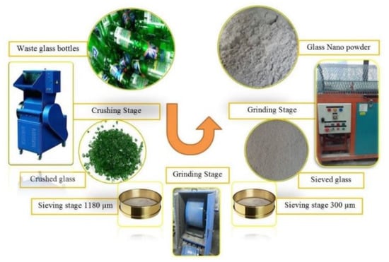 Concrete could be produced in a more sustainable manner by making use of glass waste products. At a global level, the amount of glass bottles disposed of every year figures in the millions of tons [37,38]. While a portion of the glass waste is reused, color differences, glass flaws and processing expenditure prevent the recycling of this waste in its entirety. Investigating the possibility of producing concrete, based on the use of glass, is not recent [38,39]. It has become common knowledge that ample proportions of seemingly non-crystalline aluminium and silicon could be present in bottle-derived pulverised glass waste. Thus, glass waste could be a potential pozzolanic or cement-like substance, so employing it in the form of aggregates to produce cement could be a viable option to actual cement. On the downside, the properties of the end-products could be altered by the use of glass waste [40].