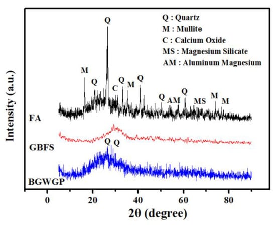 The XRD patterns associated with BGWNP, GBFS and FA are shown in Figure 2. The occurrence of crystalline alumina and silica was considered to be the reason for the sharp peaks exhibited by FA in the 2θ range of 16–30°, while the presence of crystalline mullite and quartz phases was correlated with other diffraction peaks. The amorphous nature of GBFS was validated by the absence of peaks. Meanwhile, GBFS development depends to a great extent on the occurrence of reactive calcium and silica substances. Indeed, GBFS could be optimal for the production of AAMs, precisely because of its high content of reactive amorphous calcium and silica. Considerable quantities of reactive aluminum and silica were found to be present in BGWNP, since the XRD pattern of this material highlighted its amorphous characteristics. In addition, the crystalline quartz peaks displayed by BGWNP at 27° and 29° were weak. This observation is consistent with the findings of Ismail et al. [52].