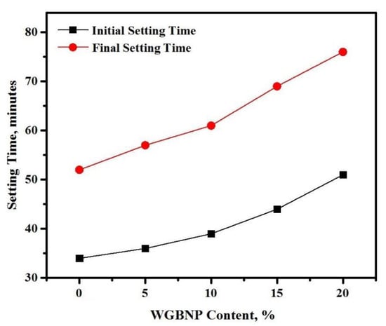The content of BGWNP affected the initial and final setting times of the AAMs, as shown in Figure 5. More specifically, as the level of BGWNP in the AAM matrix increased, the two setting times increased. Substitution of GBFS with BGWNP, from 0% to 20%, increased the initial setting time from 34 to 51 min and the final setting time from 52 to 76 min. Thus, the increase in BGWNP content led to a greater discrepancy between the two setting times. It was implied from this that the rate of setting increased with the reduction in the level of GBFS in the matrix [27]. Other studies [14,56,57] made comparable observations, with workability being noted to be improved while setting times were increased by a reduction in the ratio of calcium oxide to silicon dioxide. Nevertheless, in this work, the AAMs became more workable at a slow rate, despite the decrease in GBFS level from 30% to 10%. Hence, it was concluded that the qualities of AAMs were markedly influenced by BGWNP. There is evidence that the hydration rate can be sped up and the setting time diminished by silica and other nano-materials [55,58].