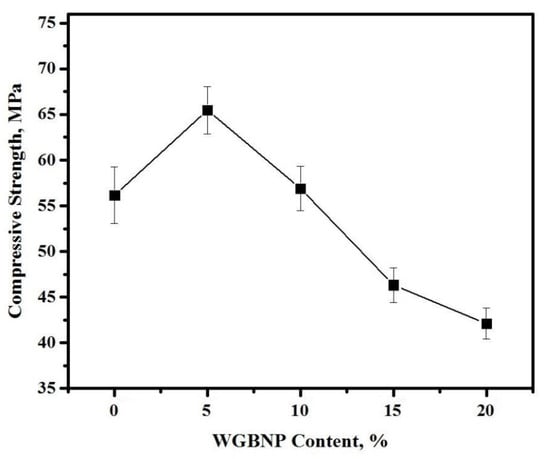 The compressive strength of AAMs cured for 28 days, in relation to the level of GBFS substitution with BGWNP, is indicated in Figure 6. There was a steady increase in compressive strength, from 56.2 to 65.5 MPa, as the BGWNP level was increased from 0% to 5%. However, an increase in the BGWNP level from 5% to 20% caused a decrease in compressive strength to 42.1 MPa. Despite the confirmed advantages of nano-silica addition to cementitious materials, a consensus is yet to be reached regarding the ideal proportion of nano-silica substitution. In this work, the way in which nano-silica was produced and the way in which BGWNP was spread in cementitious materials were the primary reasons for the strength increase. The pozzolanic reaction was chiefly intended to improve strength and diminish the distribution of pore sizes. The increase in the level of nano-silica up to 10% improved mortar compressive strength, but it decreased it at concentrations higher than 10% [48,55]. The results indicated that the compressive strength enhanced by including the nano-silica in AAMs mixtures, which is in agreement with the findings of previous studies [46,59,60]. Other research [41,43] indicated that reduced water assimilation and improved structural density, thus affording greater compressive strength, could be achieved by adding 4.0–6.0% nano-silica by the weight of FA. Nano-silica reacts with lime during the cement hydration process and it generates a C–S–H gel that may improve the mechanical strength and durability of concrete. A good dispersion of nano-silica into cement-based materials can enhance the hydration process of cement paste, allowing for a denser microstructure [61].