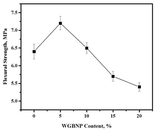 The impact of GBFS substitution with BGWNP on AAM flexural strength (FS) is illustrated in Figure 7. The AAMs were assessed for alterations in strength properties after they were cured for 28 days. It was observed that FS was inversely correlated with BGWNP when the level of the latter was no higher than 10%, while at the 0–5% BGWNP level, the FS increased by 14%. The FS improvement could be explained in terms of the fact that the occurrence of the nano-powder afforded the microstructure better hydration qualities. By contrast, a BGWNP level exceeding 10% diminished FS. More specifically, the FS was 7.2–6.4 MPa at 5–10% BGWNP and subsequently declined to 6.4–5.7 MPa at 10–15% BGWNP and 5.7–5.4 MPa at 15–20% BGWNP. At 15% BGWNP, the FS was compared with the control sample and was observed to have declined by 9.5%. This was consistent with the findings of earlier studies [62,63], which reported that BGWNP levels exceeding 10% had a negative effect on strength. A possible reason for this could be a high water requirement, which was why the hydration process was affected.