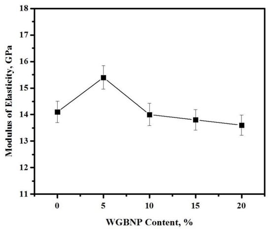 The impact of GBFS substitution with BGWNP on the modulus of elasticity (MoE) of AAMs cured for 28 days is illustrated in Figure 9. At 0–5% BGWNP, the MoE increased, but subsequently declined from 15.4 to 14.4 GPa, in comparison to the BGWNP-free control sample, which had a MoE of 14.1 GPa. By contrast, at 15–20% BGWNP, the MoE of the AAMs diminished from 13.8 to 13.6 GPa. The lower calcium content of AAMs with no more than 10% BGWNP was considered to be the reason for the reduction of not only MoE, but also of FS and STS [21].