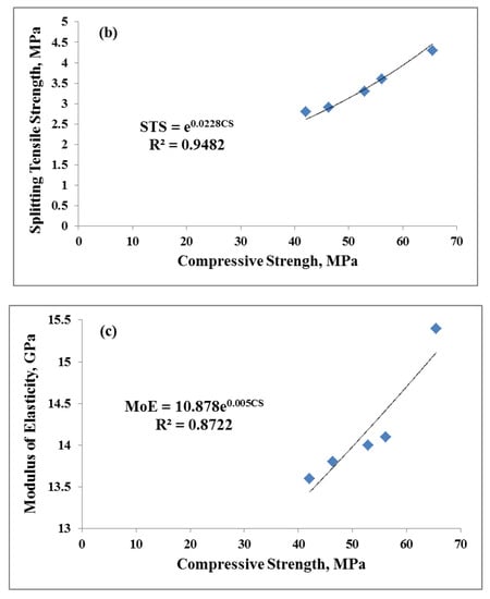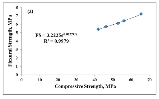 The correlation among the FS, STS, MoE and compressive strength of the AAM samples is illustrated in Figure 10. Equations (2)–(4) reveal the correlation of the empirical data based on the exponential regression technique. The correlation had a good confidence level as the R2 values were in the range 0.87–0.99.