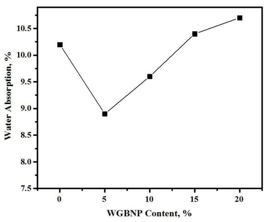 The impact of BGWNP addition on the water absorption of AAMs cured for 28 days is shown in Figure 11. The increase in BGWNP up to 10% caused a reduction in water absorption. The ratio of GBFS substitution with BGWNP had a significant effect on AAM water absorption, which was 8.9 at 5% BGWNP, 9.6 at 10% BGWNP, 10.4 at 15% BGWNP and 10.6 at 20% BGWNP. In comparison to the control sample, water absorption was lower in the samples with 5% and 10% BGWNP, which exhibited a packed pore structure. However, at a BGWNP content exceeding 10%, water absorption was increased to 10.4 at 15% BGWNP and 10.6 at 20% BGWNP. There are several explanations for these results. The elevation in BGWNP concentration from 0% to 5% caused the formation of C-A-S-H gel of higher density, improving uniform strength with reduced water absorption. In comparison to control, the sample with 5% BGWNP was less porous (12.7%), suggesting that binder hydration was favorably influenced by BGWNP. The C-S-H phase, developing due to the BGWNP nucleation effect, improved binder hydration because it was not limited solely to the grain surface, while also filling a greater proportion of pores [63]. Therefore, at 5% and 10% BGWNP, AAMs initially became less porous. Nevertheless, as the level of BGWNP rose, so did the AAM air content. Thus, when the developed C-S-H could no longer make up for the pores produced by the air trapped in the fresh mortar, there was renewed increase in porosity. Hence, it was deduced that an ideal BGWNP level providing minimal AAM porosity existed.