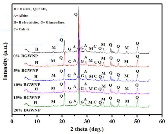 The XRD patterns and crystalline structure of AAMs cured for 28 days are shown in Figure 12. The occurrence of AAM gel was signaled by an amorphous hallow between 20° and 35°. As the albite and gismondine peaks became more intense, the effect of BGWNP incorporation in the AAM matrix emerged in the XRD patterns between 24° and 34°. By contrast, BGWNP addition made the quartz peak at 36° less intense. These two observations implied the production of a greater amount of C, N-(A)-S-H gels, which improved hydration and geopolymerisation. 5% and 10% BGWNP gave the most intense albite and gismondine peaks, in comparison to the control sample. Meanwhile, 15% and 20% BGWNP weakened the strength by having an adverse effect on geopolymerization and diminishing the formation of C, N-(A)-S-H gels.
