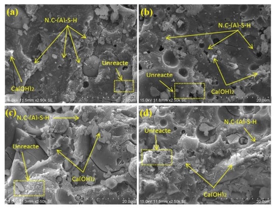 Microstructural image analysis permitted the investigation of the effect of GBFS substitution with BGWNP in AAMs. FESEM imaging of AAMs is illustrated in Figure 13, while the energy dispersive X-ray (EDX) spectra of the AAMs are shown in Figure 14. BGWNP content of 5% and 10% enabled the samples to perform exceptionally, with limited porosity and unreacted particles (Figure 13a,b). The partial reaction of FA particles was revealed by the FESEM images, while a non-negligible amount of unreacted FA spheres was left in the AAM matrix. An incomplete crystalline structure, 150–300 nm in diameter, was observed alongside the amorphous reaction products. Furthermore, on the surface of and around the FA particles, there were needle-shaped crystals, some of which were nearly entirely coated in a dense amorphous gel layer. Jang and colleagues had previously observed such crystals as well [64]. On the whole, FESEM imaging confirmed that the AAMs consisted of a combination of unreacted fly ash particles, a few crystals and a reacted gel phase. Meanwhile, as can be seen in Figure 13c,d, 15% and 20% BGWNP content led to the emergence of a greater proportion of unreacted particles with a structure displaying poor density.