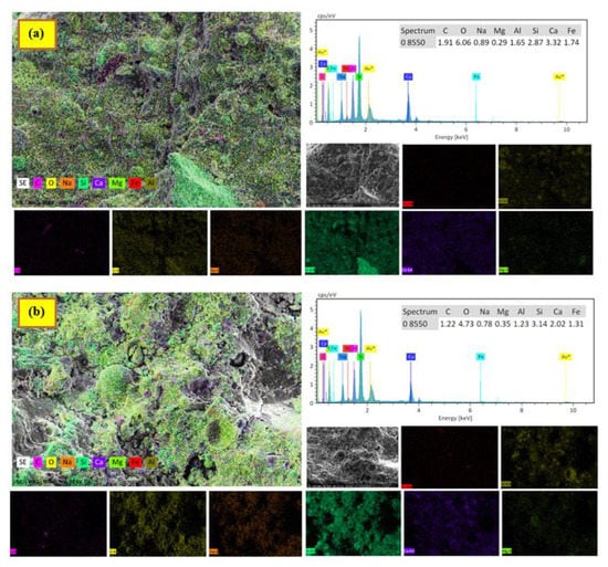 EDX spectra and maps of AAMs containing BGWNP at (a) 5% and (b) 15%.