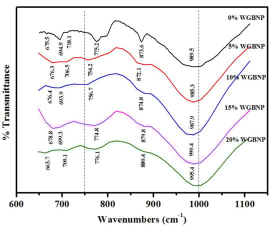 FTIR spectra of AAMs prepared with different amounts of BGWNP.