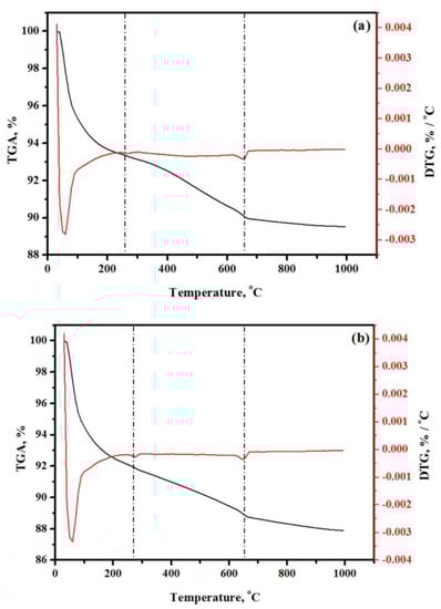 The percentage of AAM weight loss was obtained via TGA and DTG analyses. The TGA and DTG curves of AAM with 5% BGWNP are shown in Figure 16a, while the TGA and DTG curves of AAM with 15% BGWNP are shown in Figure 16b. By comparison to AAM with 15% BGWNP, which had over 12.12% weight loss and stable behavior, AAM with 5% BGWNP had weight loss of just 10.47%. Moreover, AAM with 15% BGWNP contained less C-S-H gel than AAM with 5% BGWNP (7.82% vs. 9.63%). In contrast, AAM with 5% BGWNP had a lower percentage of calcium hydroxide than AAM with 15% BGWNP (4.53% vs. 5.73%). The great quantity of C-S-H gel and the reduced proportion of calcium hydroxide were considered to be the reasons why AAM with 5% BGWNP was more stable. Thus, it was concluded that BGWNP was useful for improving AAMs in terms of microstructure characteristics and strength performance. The capacity of hydration products to make a bulk paste matrix denser and to improve the mechanical qualities and durability of mortars with nano-powder content was confirmed by Singh and colleagues as well [66].