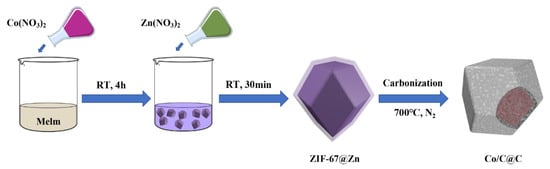 As shown in Figure 1, 2.5 g of Co(NO3)2·6H2O, 2.5 g of Zn(NO3)2·6H2O, and 5.64 g 2-methylimidazole were dissolved in 135 mL of methanol solution, respectively. Subsequently, 2-methylimidazole methanol solution was slowly and continuously dropped into cobalt nitrate methanol solution, while stirring for 4 h to obtain ZIF-67 methanol solution. Then, the solution of zinc nitrate in methanol was added to the above ZIF-67 methanol solution and stirred vigorously for 30 min. The purple product was collected by centrifugal washing with methanol three times and dried in a vacuum oven at 60 °C for 24 h to obtain ZIF-67@Zn precursor. At last, the prepared precursor was placed in a tube furnace and heated with the heating rate of 5 °C min−1 to a set temperature for 2 h under a nitrogen atmosphere (40 mL min−1), and finally slowly cooled to room temperature naturally within the tube furnace. Carbonization temperature was carried out at 700 °C, 800 °C, and 900 °C, and the corresponding products were labeled as Co/C@C-700, Co/C@C-800, and Co/C@C-900, respectively.