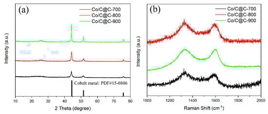 X-ray diffraction (XRD) patterns (a) and Raman spectra (b) of Co/C@C-700, Co/C@C-800, and Co/C@C-900 composites.
