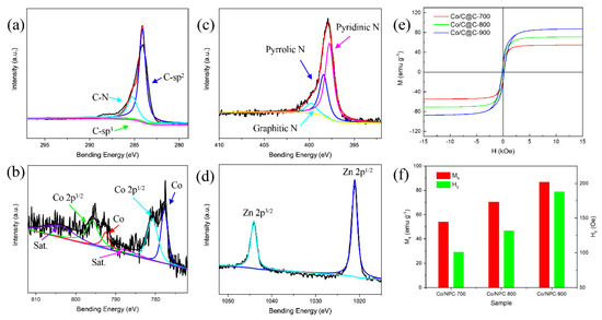 X-ray photoelectron spectroscopy (XPS) spectra of Co/C@C-800 with (a) C 1s spectrum, (b) Co 2p, (c) N 1s, and (d) Zn 2p. (e) Magnetization hysteresis loops and (f) Ms and Hc of Co/C@C-700, Co/C@C-800, and Co/C@C-900.