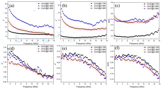 The complex magnetic permeability curves of Co/C@C-700, Co/C@C-800, and Co/C@C-900 are shown in Figure 5d–e. It can be seen that the magnetic permeability fluctuates in a small part of the frequency range with a tendency to increase firstly and then decrease as the carbonization temperature increases from 700 °C to 900 °C. The real part μ′ and the imaginary part μ″ of the magnetic permeability show a decreasing trend with increasing frequency, and μ′ and μ″ fluctuate between 1.14 and 1.26 and −0.14 and 0.06, respectively.