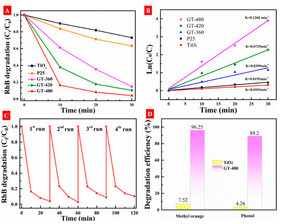 | Graphene-P25 | Hydrothermal reaction of graphene and P25 | Solar light 100 W | 100 mL RhB, 0.03 mmol/L | 6.3 mg | T90% = 15 min | [52] |