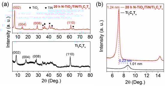 (a) XRD patterns of Ti3C2Tx and 20 h N-TiO2/TiN/Ti3C2Tx, (b) XRD patterns of Ti3C2Tx and 20 h N-TiO2/TiN/Ti3C2Tx over a small range of 2θ from 5–15°.