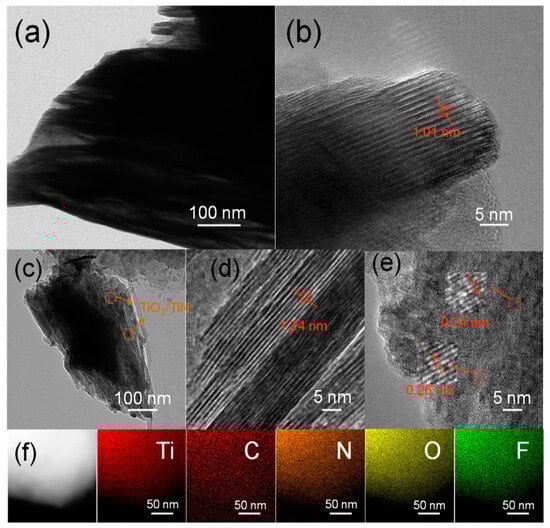 Transmission electron microscopy (TEM) and high-resolution TEM (HRTEM) images of (a,b) Ti3C2Tx and (c–e) 20 h N-TiO2/TiN/Ti3C2Tx. (f) EDS element mapping of 20 h N-TiO2/TiN/Ti3C2Tx.