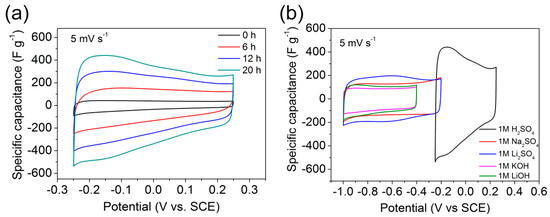 Electrochemical performance of Ti3C2Tx and N-TiO2/TiN/Ti3C2Tx electrodes in a three-electrode system. (a) CV profiles at 5 mV s−1 for N-TiO2/TiN/Ti3C2Tx electrodes in 1 M H2SO4. (b) CV profiles at 5 mV s−1 for 20 h N-TiO2/TiN/Ti3C2Tx in different electrolytes.