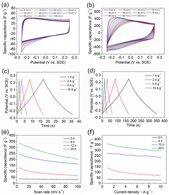 Figure 8a,b illustrate CV curves of Ti3C2Tx and 20 h N-TiO2/TiN/Ti3C2Tx electrodes at scan rates from 5 to 100 mV s−1, respectively. Figure 8a shows better symmetric properties than Figure 8b due to the reversible redox reaction which will affect the stability of the electrodes. However, the Ti3C2Tx possesses smaller rectangular curves, corresponding to lower capacitances, while the 20 h N-TiO2/TiN/Ti3C2Tx exhibits superior capacitive performance. Across all scan rates, the CV curves of Ti3C2Tx and 20 h N-TiO2/TiN/Ti3C2Tx electrodes maintain similar shapes, which displays a slight shift of the anodic and cathodic peaks. The GCD curves of Ti3C2Tx and 20 h N-TiO2/TiN/Ti3C2Tx electrodes at current densities of 1, 2, 5, and 10 A g−1 are shown in Figure 8c,d, respectively. All of the curves are nearly linear symmetrical and exhibit typical triangular shapes with inconspicuous voltage drops (iR drop) at different current densities, which indicates that the little overall resistance and excellent electrochemical reversibility are achieved.