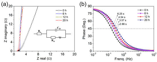 Figure 9a records the Nyquist impedance of EIS spectra to investigate the ion-transport behavior and the internal resistance of the electrodes. The Nyquist plots are consisted of a high frequency semicircle and a low frequency linear branch, corresponding to charge transfer resistance Rct and Warburg impedance W, respectively. Equivalent series resistances of Ti3C2Tx, and 6, 12 and 20 h N-TiO2/TiN/Ti3C2Tx electrodes are found to be 1.43 Ω, 1.41 Ω, 1.38 Ω, and 1.13 Ω, respectively. It suggests that 20 h N-TiO2/TiN/Ti3C2Tx electrode exhibits best conductivity because of its larger electroactive surface areas and lower charge transfer resistance [29]. Nyquist plots of 20 h N-TiO2/TiN/Ti3C2Tx in different electrolytes are plotted in Figure S7. Figure 9b shows the Bode plots of all electrode materials. The phase angle of the 20 h N-TiO2/TiN/Ti3C2Tx electrode is close to −83.0° at a frequency of 0.01 Hz, indicating that the capacitive performance of the electrode is close to that of an ideal capacitor. The characteristic frequencies, f0, for the phase angle of −45° are 0.16, 0.22, 0.28 and 0.35 Hz for the Ti3C2Tx, and 6 h, 12h, and 20 h N-TiO2/TiN/Ti3C2Tx. The corresponding time constants τ0 (=1/f0) were calculated to be 6.25, 4.54, 3.57 and 2.86 s, respectively. The fast frequency response of 20 h N-TiO2/TiN/Ti3C2Tx may owing to the nitrogen doping, which can enhance the electrolyte ion transport rates [65,66].
