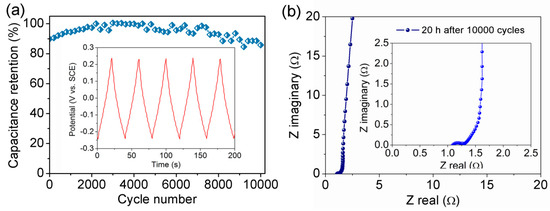 Electrochemical stability is one of the most important factors in practical application of pseudocapacitor electrodes. Figure 10a shows the GCD cycling stability of the 20 h N-TiO2/TiN/Ti3C2Tx electrode at a current density of 8 A g−1 along with the triangular shape of the last five GCD cycles in the inset of Figure 10a. It is found that above 85.8% of the capacitance remained after 10,000 cycles for the 20 h N-TiO2/TiN/Ti3C2Tx electrode, possessing a prominent cycling stability. Nyquist plot of the 20 h N-TiO2/TiN/Ti3C2Tx electrode after 10,000 charge/discharge cycles (Figure 10b) shows that the 20 h N-TiO2/TiN/Ti3C2Tx electrode still maintains well low equivalent series resistance of 1.08 Ω. The above-mentioned results reveal that the 20 h N-TiO2/TiN/Ti3C2Tx electrode is very stable and relatively invertible during cycling. Hence, it can be concluded that the 20 h N-TiO2/TiN/Ti3C2Tx electrode is promising for supercapacitor application.