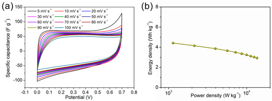 Electrochemical performance of the symmetric 20 h N-TiO2/TiN/Ti3C2Tx//20 h N-TiO2/TiN/Ti3C2Tx supercapacitor in 1 M H2SO4. (a) CV profiles at different scan rates under the potential of 0.7 V. (b) Power density versus energy density plot of the symmetric supercapacitor by CV test.