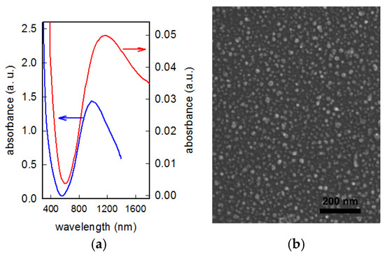 (a) UV–Vis spectrum of a CuS NP-glass sample (red line, absorbance on right axe) compared with the spectrum of the colloidal suspension used for functionalization (blue line, absorbance on left axe); (b) SEM image of the CuS NP-glass sample.