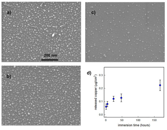 Immersion in a controlled amount of ultrapure water (3 mL) of a standard CuS NP-glass sample was performed in order to assess the quantity of copper released as a function of immersion time. The glass slides were immersed for 1, 5, 24, 48, and 168 h, and after this time removed from the liquid. The UV-Vis-NIR spectra of solutions obtained after immersion were taken, demonstrating the absence of spectral features typical of CuS NP, allowing to rule out the release of NP. Solutions were subsequently analyzed with ICP to detect the quantity of copper released in solution. The experiment was repeated three times. The results are reported in Figure 3d, where the copper released from slides is expressed as micrograms released per cm2 of surface, to be compared with the mean total quantity of copper loaded previously indicated, which was 0.5(1) μg/cm2. After 24 h we found that about 20% of copper loaded on the surface was released, a value reaching about 50% after one week of immersion. To complete this measure, one freshly prepared sample was divided into three pieces, and three SEM images were taken (Figure 3a–c): one soon after preparation, one after 24 h of immersion, and one after one week of immersion in water. No evident changes could be observed for the 24 h immersed sample, apart from a hardly detectable degree of consumption of NP. After one week the dimensions seem sensibly reduced, and also the number of grafted NP seemed to be decreased: at this point it is hard to assess if this has to be ascribed to consumption of smaller objects or also to detachment of some nanoparticles, which anyway were not detected with the spectrophotometer on the resulting solution. We must stress that these experiments were performed in ultrapure water, in analogy with previous experiments performed on Ag nano-objects [7,13], thus these measurements can be judged as only qualitative, especially when planning to move to biological media where biomolecules could give chelating complexes with copper ions. Nevertheless, these experiments indicate that the investigated samples were capable of a slow release of very small quantities of copper ions upon immersion in water (well below 0.5 mg/L in the conditions of the release). These findings suggest this sustained release could be used for antibacterial purposes while at the same time not being harmful to human cells: as recently demonstrated, CuS nanoparticles releasing similar quantities of Cu(II) ions can promote wound healing while producing antibacterial activities [22]. Copper is released as a function of immersion time, giving a constantly increasing concentration for at least a week, with a sensible quantity released in the first 24–48 h of immersion (without NP detachment), a timescale which usually is critical for fighting bacterial proliferation. After immersion in water for one week we also noticed a strong decrease in the intensity of plasmonic absorption and a blue shift of the weakened plasmonic band, which tends to go back below 1000 nm (see Figure S3). This blue shift can be explained by reduced plasmonic coupling, as the more the particles decrease in dimensions (in some cases reaching complete dissolution, see Figure 3c), the less they can interact to give plasmonic coupling.