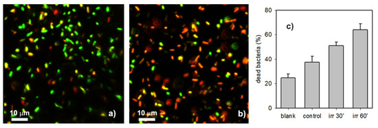 Thus, we moved to evaluate the antibacterial action resulting from the localized photo-thermal effect upon NIR light activation. In these experiments, P. aeruginosa cells were inoculated onto the glasses and exposed to NIR laser irradiation. P. aeruginosa is known to be one of the most common opportunistic pathogens and with high adaptability to environmental changes [36]. Therefore, it is essential to develop new and light-weight approaches aimed at efficient eradication of such type of bacteria. We set the value of irradiation wavelength to 950 nm, in the upper limit of the first biological window. In order to keep the obtained maximum temperature increase close to 10 °C we raised the power to 450 mW, reaching an irradiance of 0.35 mW/cm2, a value which is still close to maximum allowing for exposure of the skin (0.32 W/cm2) [33]. In these conditions we obtained the thermogram reported in Figure S4. We did not irradiate blank glass with the laser as in previous papers [1,13] we demonstrated that even high laser intensities cannot kill bacteria in the absence of photo-thermal effects. The samples were irradiated continuously for 30 and 60 min. They were then stained and analyzed by means of confocal microscopy and compared to the control samples (non-irradiated inoculated films, both blank and functionalized). We segmented the red emitting (propidium iodide stained, dead) cells and the green emitting (SYTO® 9 stained, live) cells, and the antibacterial effect was measured as the ratio of red to the green area of the image Adead/Alive.