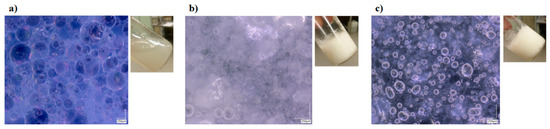 Micrographs of (a) pickering emulsion, (b) bigel, and (c) NPs bigel.
