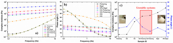 Apart from microscopic analysis, rheological investigation was also carried out for the prepared systems, which is a useful tool to analyse the structure–property relationship in different systems [19]. Frequency sweep tests were performed, within the linear viscoelastic regime, for the samples to investigate their mechanical properties without disturbing the structure. In order to compare the properties of gelled systems, individual gels based on water phase (HG) and oil phase (OG) were also analysed. The results are presented in terms of complex modulus and phase angle as a function of frequency for different systems (Figure 2a–c). Three systems (pickering emulsion, hydrogel, and organogel) showed liquid-like behavior with smaller complex modulus values, higher phase angle values, and strong dependence of these properties on the frequency. On the other hand, remaining samples displayed solid-like characteristics with higher modulus and lower phase angle values. It is clearly evident that the incorporation of nanoparticles (i.e., interfacial stabilization) into the bigels resulted in better mechanical properties, see Figure 2c. This analysis also verifies the synergistic enhancement in the properties of the dual stabilized oil/water system. However, polymeric chains can also stabilize the interface or can modify the surface properties of nanoparticles, which needs further investigation.