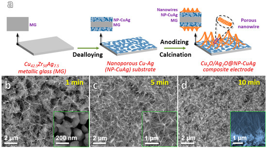 The schematic synthesis process of CuxO/Ag2O@NP-CuAg (x = 1, 2) is depicted in Figure 1a. The Cu42.5Zr50Ag7.5 (at.%) metallic glass (MG) ribbon as a dealloying precursor alloy was fabricated by arc-melting and single-roller melt-spinning process [14]. Then, nanoporous copper silver (NP-CuAg) substrate was obtained by dealloying Cu42.5Zr50Ag7.5 ribbon in 0.05 M HF for 8 h. During the dealloying process, Zr element exhibited highly active electrochemical property in HF and selectively dissolved into HF solution [15,16,17], leaving the inert metals of Cu and Ag behind to further assemble to nanoporous bimetallic CuAg (NP-CuAg) network substrate. Finally, the anodizing measurements (Huatai, DC Power Supply, HAP 10-200, Yangzhou, China) were applied for NP-CuAg in 0.5 M KOH with the current density of 15 mA cm−2 for different time. The NP-CuAg and commercial Pt net electrode were employed as working and counter electrodes, respectively. Then, the anodized samples were rinsed three times with distilled water and further calcined in muffle furnace at 473 K for 2 h in the air. All experiments except for calcination were performed at 298 K. Note that the anodized samples for anodizing time of 1, 5 and 10 min are labelled as CuxO/Ag2O-1, CuxO/Ag2O-5 and CuxO/Ag2O-10, respectively.