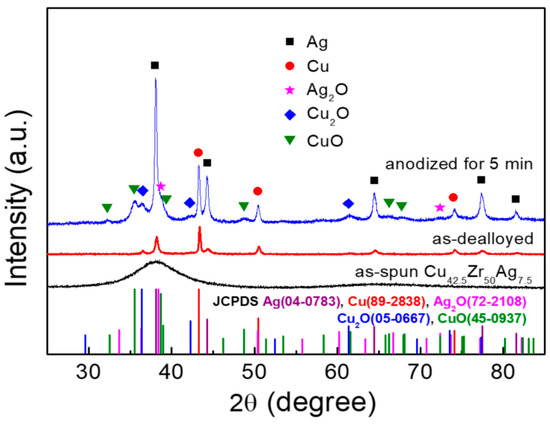 The XRD patterns of the as-spun, as-dealloyed and anodized samples were shown in Figure 2. It is found that as-spun ribbon has the broad diffraction halo peak, showing the formation of amorphous structure. Moreover, no Zr element is detected in the as-dealloyed sample, indicating that Zr element is selectively dissolved [15,16,17], leaving the bimetals of Cu and Ag behind to assemble to nanoporous bimetallic CuAg network (NP-CuAg) (the inset of Figure 1b). After anodizing for 5 min followed by calcination, the crystalline phases of anodized sample are identified to be Cu (JCPDS #89-2838), Ag (JCPDS #04-0783), Cu2O (JCPDS #05-0667), CuO (JCPDS #45-0937) and Ag2O (JCPDS #72-2108), confirming the formation of CuxO/Ag2O (x = 1, 2) bimetallic oxides on the NP-CuAg network.