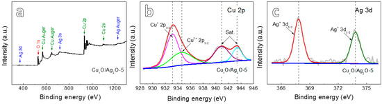 (a) XPS spectrum of the CuxO/Ag2O-5; (b) Cu 2p XPS spectrum of CuxO/Ag2O-5; (c) Ag 3d XPS spectrum of CuxO/Ag2O-5.