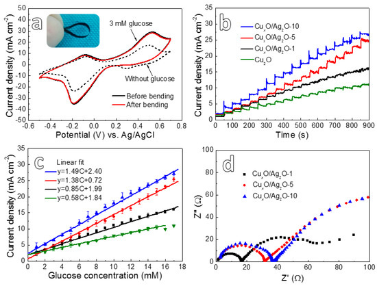 As compared to the free-standing monometallic Cu2O nanowires composite (Cu2O@NP-Cu) [19], it should be emphasized that the new CuxO/Ag2O@NP-CuAg electrodes not only keep good mechanical integrity, but also could withstand a large degree of bending (inset photo of Figure 5a), indicating a good flexibility. The CVs measurements in 0.2 M NaOH with 3 mM glucose (Figure 5a) are performed for the flexible CuxO/Ag2O@NP-CuAg electrode before and after bending. It appears that both the CVs almost coincide to each other. Moreover, the oxidation peak appeared at 0.5 V is clearly higher as compared to that in the NaOH without glucose, which demonstrates the electrode modified by bimetallic CuxO/Ag2O oxide nanowires possesses high glucose sensing performance.