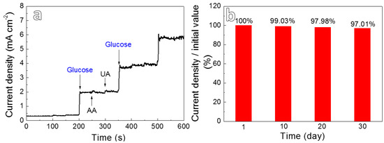 (a) Anti-interference ability measurement of CuxO/Ag2O-10 at an applied potential of 0.5 V; (b) the stability of the CuxO/Ag2O-10 electrode over a period of 30 days.