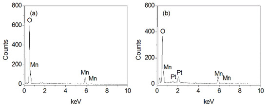 EDS was applied to determine the chemical composition of obtained samples, it confirms the existence of Mn and O. For the MnOOH/Mn3O4, the atomic ratio of Mn to O is 35.45:64.55 (Figure 3a), and the atomic ratio of Mn/O is less than 3:4, but larger than 1:2, which also suggests that the obtained product is the mixture of MnOOH and Mn3O4. For the Mn3O4 nano-octahedrons, the atomic ratio of Mn to O is 41.42:58.58, which is close to 3:4 and certifies the formation of Mn3O4.