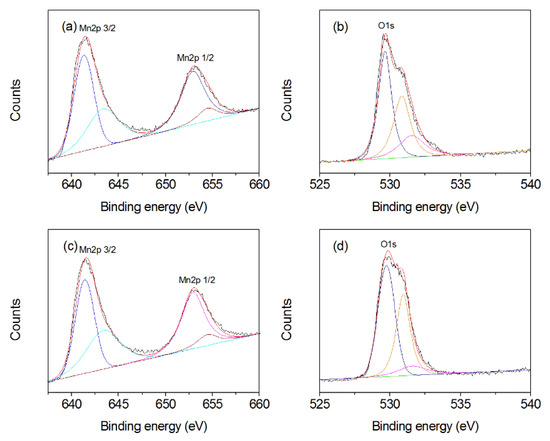 The surface composition and valence state of obtained products were analyzed by the XPS spectrum, as shown in Figure 5. For the MnOOH/Mn3O4, the Mn2p spectrum shows that the peaks of Mn2p3/2 and Mn2p1/2 center at 641.5 and 653.1 eV, respectively (Figure 5a). It can be deconvoluted into two pairs of doublets by fitting with the Gaussian function. The former doublet at 641.3 and 643.35 eV corresponds to Mn3+ 2p3/2 and Mn2+ 2p3/2, respectively, while the latter doublet at 652.90 and 654.45 eV could be attributed to Mn3+ 2p1/2 and Mn2+ 2p1/2, respectively [40]. Quantitative analysis indicates that the ratio of Mn2+/Mn3+ is about 1:4. Considering the different valence ratio of the Mn element in the Mn3O4 and MnOOH, the above calculated value is reasonable. O 1s spectrum can be decomposed into three components (Figure 5b). The first peak at 529.65 eV is the characteristic of lattice oxygen, the second peak at 530.85 corresponds to the O2− ions in oxygen vacancy defect regions, and the third peak at 531.55 eV is related to the adsorbed oxygen or dissociated oxygen [40,41]. The relative percentages of above three O components are 47.3%, 34.5%, and 18.2%.