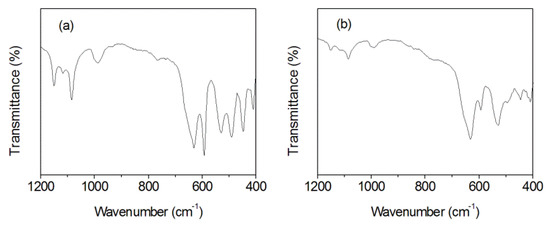 FT-IR spectra can be used to confirm the formation of Mn3O4 and MnOOH [40,46]. For the MnOOH/Mn3O4 (Figure 6a), sharp peaks at 448, 491, and 593 cm−1 are the characteristic modes of Mn-O bonds in Mn3O4 and γ-MnOOH [47]. The peak at 418.6 and 531 cm−1 are the characteristic stretching mode and the bending mode of Mn-O bond at the octahedral sites of Mn3O4, respectively [48]. The peak at 632 cm−1 originated from the stretching vibrations of the Mn-O (Mn3+) bond at the tetrahedral sites in the Mn3O4 [10,49]. The peak at 1085 cm−1 corresponds to the out-of-plane bending vibration of γ-OH, while the peaks at 1118 and 1151 cm−1 arise from the in-plane bending vibrations of δ-2-OH and δ-1-OH, respectively [50]. The above vibration absorption bands are consistent with that of the reported γ-MnOOH and hausmannite Mn3O4.