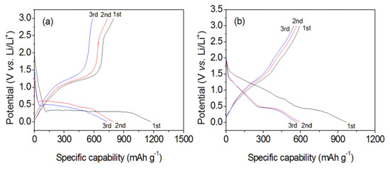 During the galvanostatic measurements, the current density was set at 1.0 A g−1, while the cutoff voltage was conducted within 0.01–3.0 V. The discharge/charge curves in initial three cycles were presented (Figure 7). For the MnOOH/Mn3O4 electrode, the discharge voltage drops steeply to 0.34 V. A long discharge voltage plateau at 0.3 V can be found in the first discharge curve, which comes from the reaction between MnOOH/Mn3O4 and Li [20,55]. In the second discharge process, the main voltage plateau at 0.58 V originates from the reaction between the MnO and Li, the formation of Mn and amorphous Li2O [20]. In the third discharge curve, a discharge voltage plateau appears at 0.50 V. For the charging–discharging curves of the Mn3O4 nano-octahedrons electrode, a short voltage platform at 0.43 V can be found in the first discharging curves, which arises from the reaction occurred between Mn3O4 and metallic Li. In the second and third cycles, the discharge curves are coincided with each other, and the well-defined discharge voltage platform at 0.45 V originates from the reaction between the MnO and Li. The results indicate that the main discharge platform does not change obviously in the following cycles.