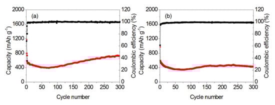 The long-term cyclabilities of as-prepared samples were recorded, as shown in Figure 8. For the MnOOH/Mn3O4 electrode, the specific capacities in the first discharge and charge processes are 1172.1 and 796.3 mAh g−1. The low coulombic efficiency of 67.9% is related to the formation of solid electrolyte interphase (SEI) film [56]. However, the discharge and charge specific capacities decrease to 793.1 and 753.4 mAh g−1 in the second cycle. SEI films retard further lithiation of the inner part of Mn specimens and result in decreased discharge/charge capacity [57]. At the same time, the coulombic efficiency increases up to 92.7%. Cyclic performance examination reveals that the charge/discharge specific capacity continuously reduces to 391 mAh g−1 in the 73rd cycle. Since then, the discharge/charge specific capacity gradually increases. Finally, the discharge and charge capacity gradually increased to 724.2 and 722.4 mA h g−1 in the 300th cycle. Because the shape and size of formed MnOOH nano-columns and Mn3O4 nano-octahedrons are inhomogeneous, the cracking and fragmentation that originate from the stress during the lithiation reaction will lead to the increased discharge/charge specific capacity.