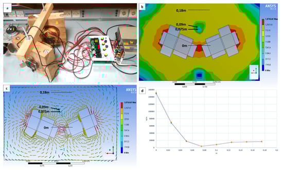 The electromagnetic system, as well as the control system regulating the current at each coil, was constructed at our laboratory facilities. The validation of the design was done using a Hall sensor in order to compare the generated field with the values from the simulations. Measurements and simulations were taken for 18 A at the outer coils and 6 A in the inner coils. In Figure 2, the whole apparatus is shown together with the simulation results. Experimental measurements are compared and a very small deviation between them can be observed. In Figure 2b, the magnetic field intensity that propagated at a straight line from the middle of the cores is depicted for 18 A at the outer coils and 6 A in the inner coils. At a distance of 7.5 cm from the cores, for the specific values of current in the coils, the magnetic field intensity is minimized due to the opposite direction of the vectors at this point.