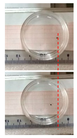 For this experiment we used a microdroplet with a volume of 10 μL of water-soluble ferrofluid material placed in 100% oleic acid (Figure 4). The petri disc containing the microsphere of ferrofluid nanoparticles and oleic acid was put at a specific distance (9 cm) from the cores in order to align the microdroplet with the point where outward force was maximum (Figure 4), and electromagnets were activated as described previously. Due to the high viscosity of the oleic acid and the size of the specimen, the movement of the microdroplet was restricted only to a few mm as seen in Figure 4. Nevertheless, this significant magnetic push received by the microdroplet demonstrates that it is possible to remotely control paramagnetic material.