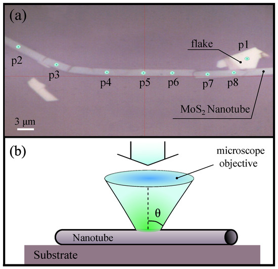 (a) Image of a MoS nanotube (NT) taken inside the micro-photoluminescence (micro-PL) setup. The NT has few cracks that are not essential for our experiment. Green dots indicate spots where the micro-PL was measured. (b) Schematic of NT excitation at micro-PL measurement (not to scale). As shown, the lens collects the emission at angles .